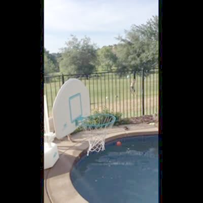 A young boy throws a basketball into a hoop and jumps into a pool.