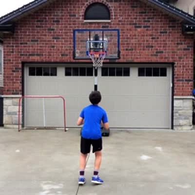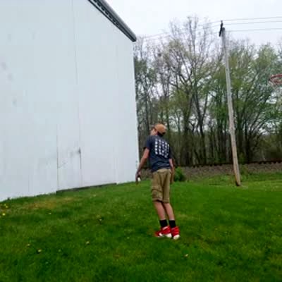 A man throws a ball over a garage, it bounces and then goes through the hoop. Clip plays regular speed, slow motion, and then sped up.