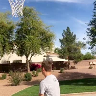 A man throws a football over his house and it goes through a basketball hoop in his backyard.