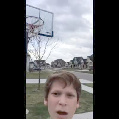 A man stands on a roof and throws a basketball towards a hoop. The ball misses the goal entirely and hits the camera.