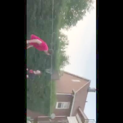 Men, young boys and young girls jump in a pool and stand on the roof of a house as they do basketball trick shots.