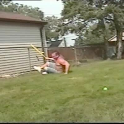 A man spins in circles outside and then hits a ball and runs into a tree at 0:34.