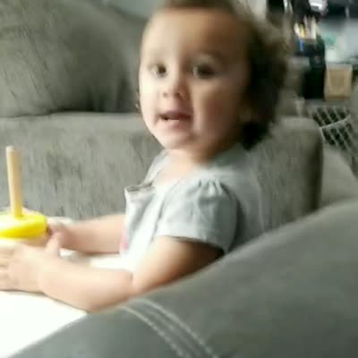 A woman asks a tot girl if she wants a bath and she excitedly says "I do" in a living room.