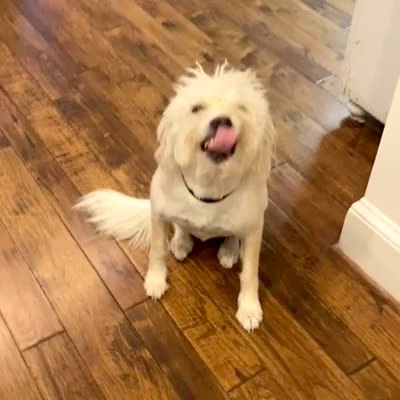 A dog smiles for the camera in the living room while a man asks her to go take a bath.
