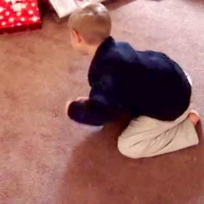 Christmas prank. Young boy in bathrobe opens a roll of toilet paper as a gift and looks confused and then mad. He throws it at dad / the camera.