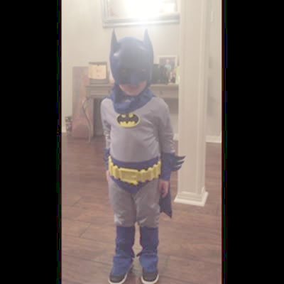 A young girl wears a batman costume while she sits on a toilet. The face on her batman mask looks like he is straining to poop and makes her mother laugh throughout the video.