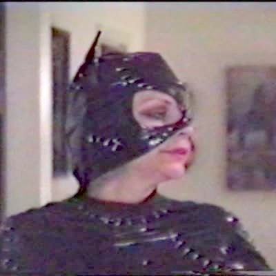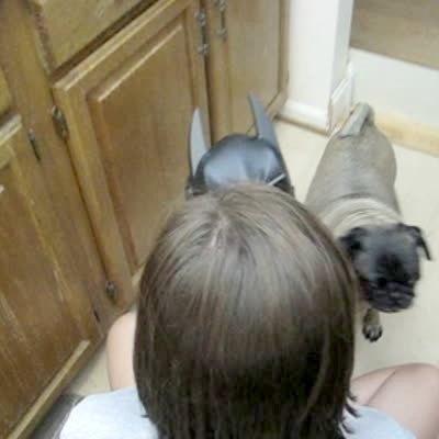 Pug dog wears a Batman mask in the kitchen while teen girl holds him. Very short clip.