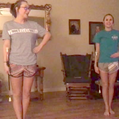 Two teen girls do a baton routine. One of them shatters the overhead light.