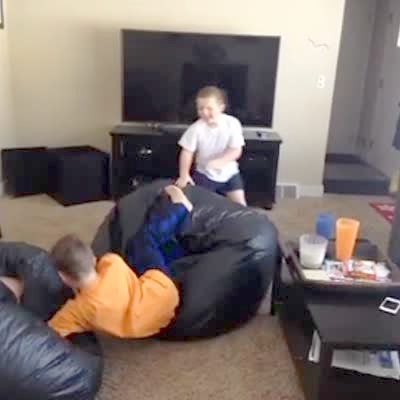 A young boy jumps on to a bean bag chair and knocks over a toddler who is leaning on the bean bag.