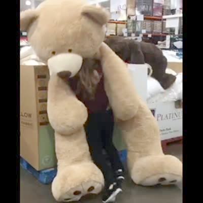 A young woman carries a large oversized stuffed bear in a store and struggles to put it in a box. It tips over and falls on her and she gets stuck underneath it.