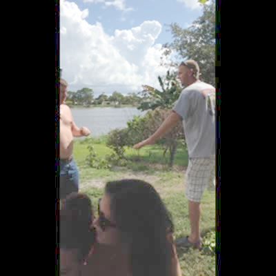 A man sits on a water tube on a river as he listens to music and punctures his beer can with his keys. He then throws his keys into the water and doesn't notice until a woman tells him what he just did. Music rights not cleared.