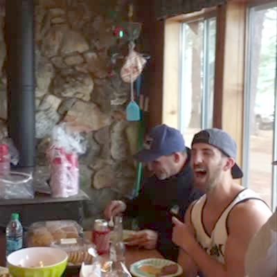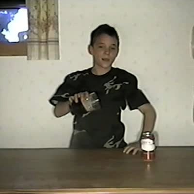 A young man puts a hole in his dad's beer can as a prank in the living room so that when he drinks it, it pours out on his chest. It happens three times and he still doesn't realize it.