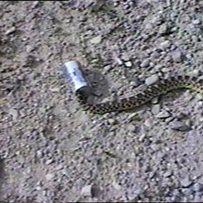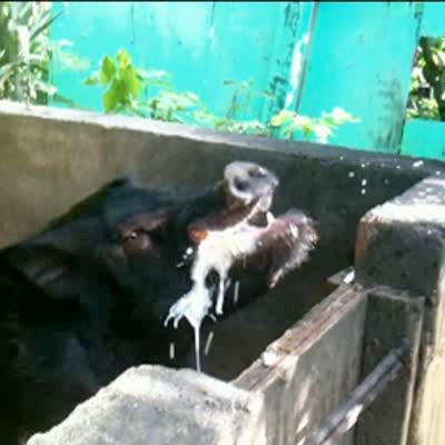 Pig bites at a beer can, it explodes. Pig continues to chew on it. Farm, barn.