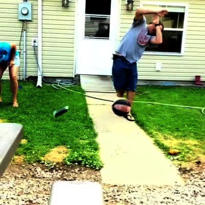 A man in a yard drops a basketball with a beer can on it and the can bounces up and hits him in the groin and he falls down.