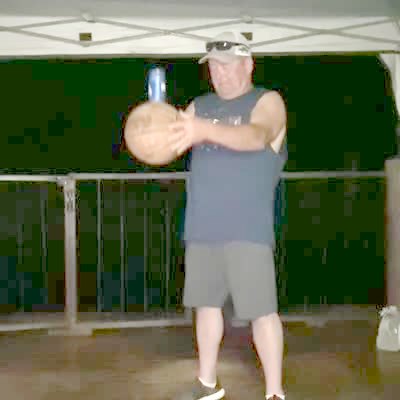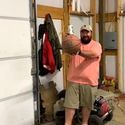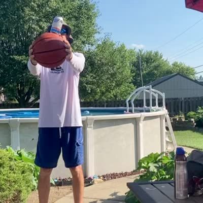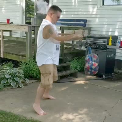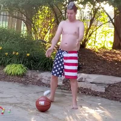 A man bounces a beer can on a basketball in the backyard, and the can hits him in the groin.