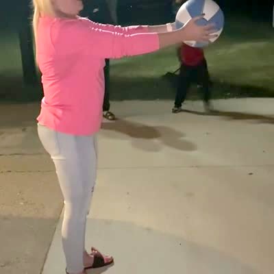 A woman does the ball drop beer challenge in the driveway. She catches the can and drinks the beer. A man goes after her and he catches the drink too. A senior woman goes next and the can bounces up and hits her in the face.