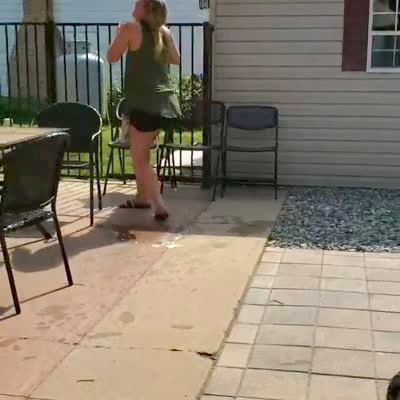 A woman holds out a funnel so a man can drink beer out of it in a backyard. He lifts the funnel above his head and the beer spills all over his head.