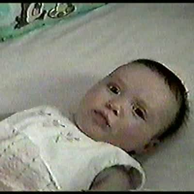 Baby girl in crib looks peacefully at mom (camera), dad burps / belches loudly OC, surprises / scares baby. She starts crying hard.