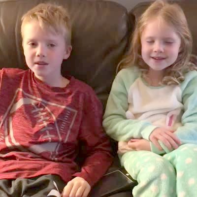 A young girl and a young boy sing "Happy Birthday" in the living room, but stop and laugh when the girl burps at the same time that the boy sneezes.