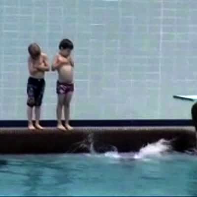 A little boy tries to dive into a pool during swim class but belly flops hard at 0:12.