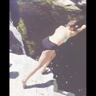 A woman tries to jump off a cliff into into a lake but she slips and falls in. Featured talent cleared only (woman who falls into the water).