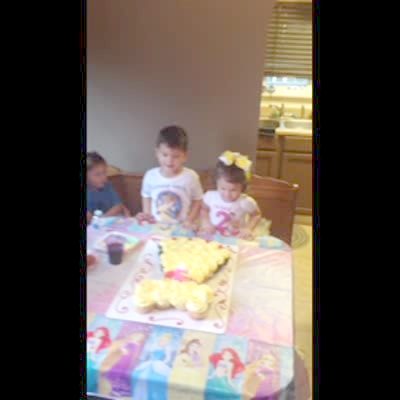 A tot girl climbs on top of her birthday cake to blow out the candle in the kitchen.