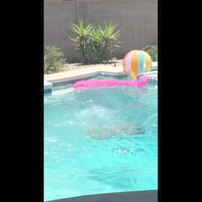 A woman belly flops onto a swan pool float and breaks the wing off in a pool.