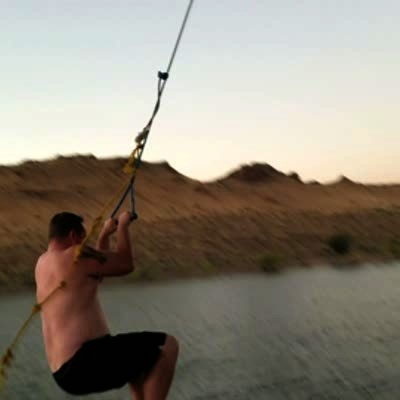 Man tries to fix a rope swing and swing out over a river, it breaks and he falls on his face on the shore.