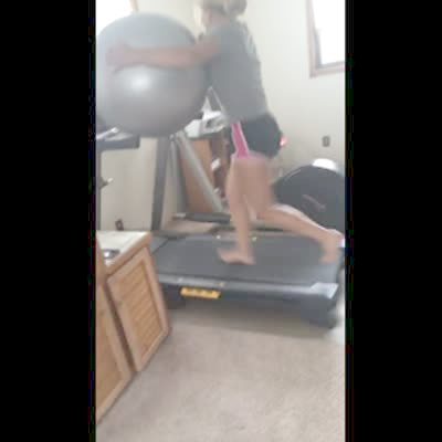 A teen girl runs on a treadmill with an exercise ball, belly flops on the ball and falls down.