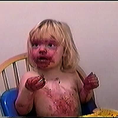 TOT GIRL IN HIGH CHAIR COVERED IN BLUEBERRY AND BLACKBERRY GUNK SINGS "I Been Workin' On The Railroad". Mess