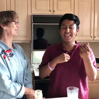 A teen boy chokes on and spits out a spoonful of horseradish onto a group of salads on the kitchen counter after he tries to eat it for a bet.