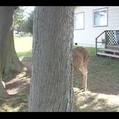 Two deer are on a front lawn. A woman and a dog look out of the window at them. The woman opens the blinds to see them better. The dog jumps through the window and breaks the glass.