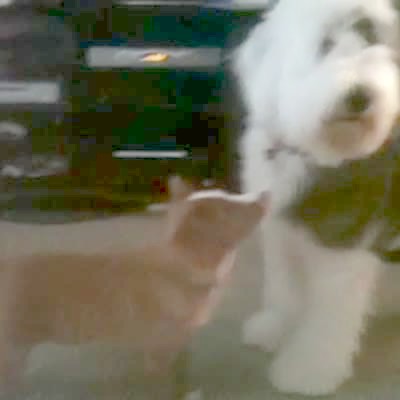 Big Sheepdog knocks small brown dog over with its butt in living room. Short.