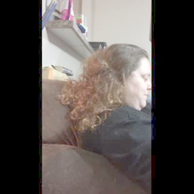 A woman with big hair sits indoors as a man behind the camera asks if we can see a dog because she's in camouflage. He calls the dog and she emerges from the woman's hair.