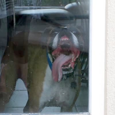 A boxer dog licks a window with an unusually large tongue.