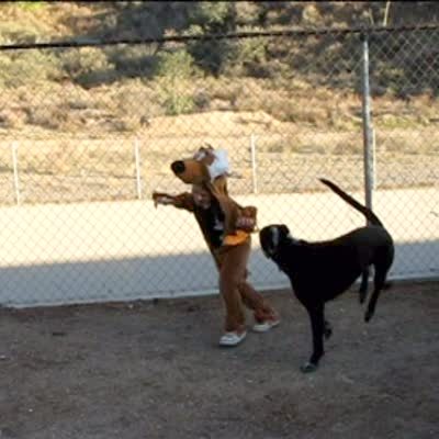 Big dog in backyard jumps on boy wearing a Scooby Doo costume and tears it to shreds.