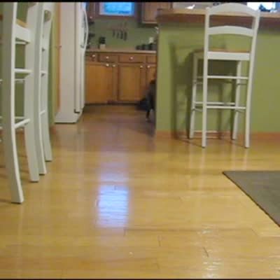 "Cold-Blooded Canine" Big dog opens refrigerator door & takes out food, then pulls out an entire shelf, leaving the fridge almost empty. Destroys fridge. Hidden camera. Blurry camera. Long for edit. Needs pull ups