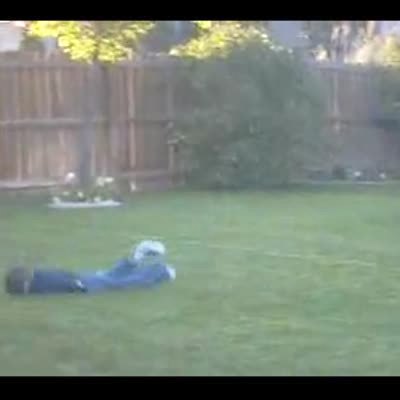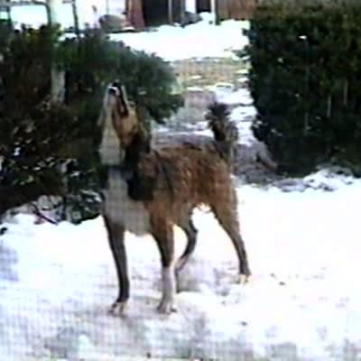 A big dog gets buried in snow at 0:15 when trying to hop into yard.