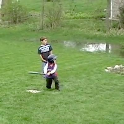 Boy playing baseball in the backyard trips over big dog when running the bases & falls down.