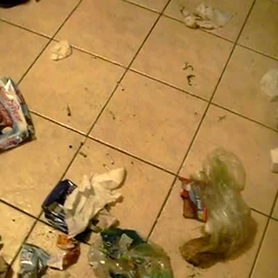 "Mutt Makes A Mess" Woman films big mess in kitchen, asks bulldog if he did it. Camera pans to another dog with a trash can lid stuck over its head.