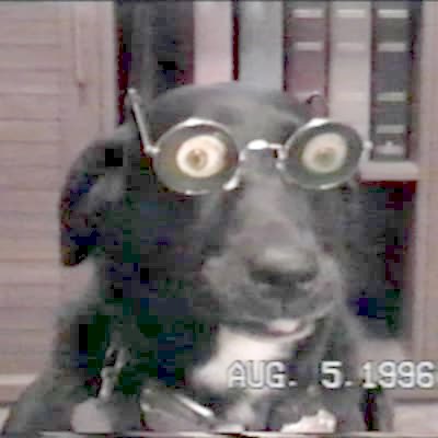 Dog wears eye glasses with big cutout eyes stuck on. Funny visual