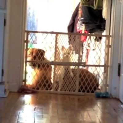 "Camera Confuses Canines" A dog sits on the living room floor and reacts with a bark when its owners talk via the Ring camera. Another big dog comes out after it hears its owners. A man and woman cackle when both dogs put their faces up to the camera to investigate. Security footage.