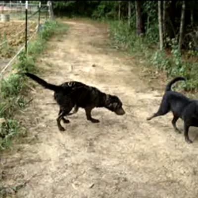 "Sneaky Treat Taker" A small dog attempts to sneak a bone away from a larger dog. The small dog won't make eye contact with the big dog, the small dog slowly backs away with the bone until the large dog barks, then the small dog runs away with it.
