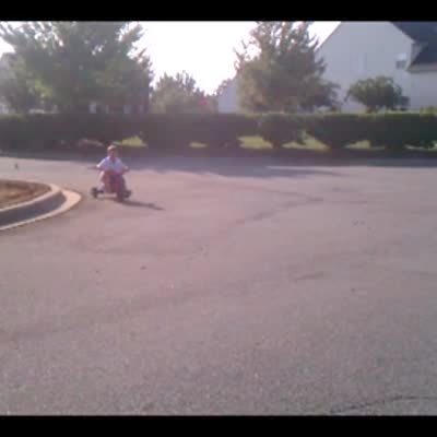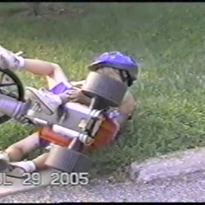 A boy rides a big wheel tricycle down a road. He crashes into the curb and falls on the sidewalk. Not a big fall. Short tails.