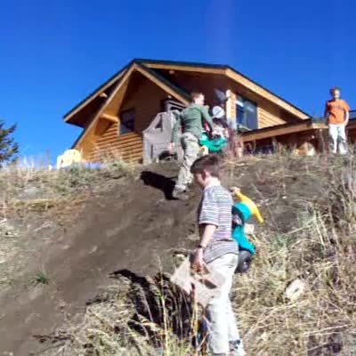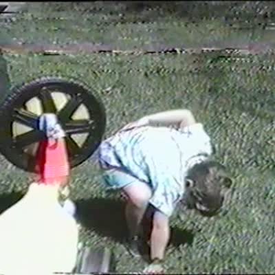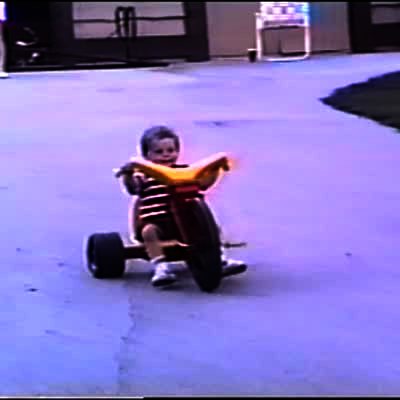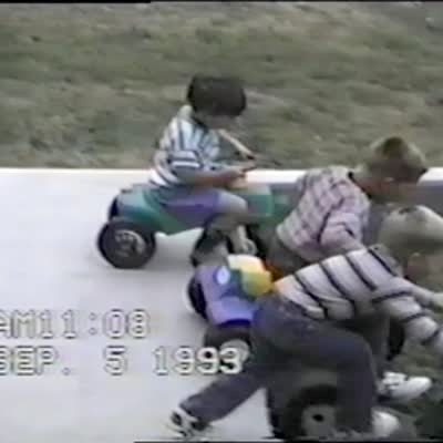 Three young boys race down a driveway on big wheels. Two of the boys bump into each other. One boy hurts his crotch. Short tails. .