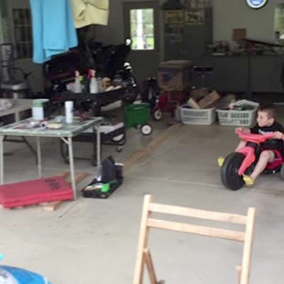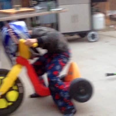 Young boy rides his Big Wheel bike over a ramp & falls twice. His big brothers cheer him on.