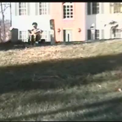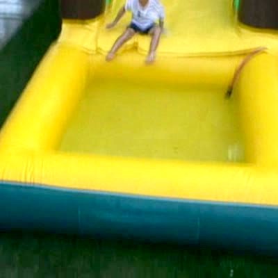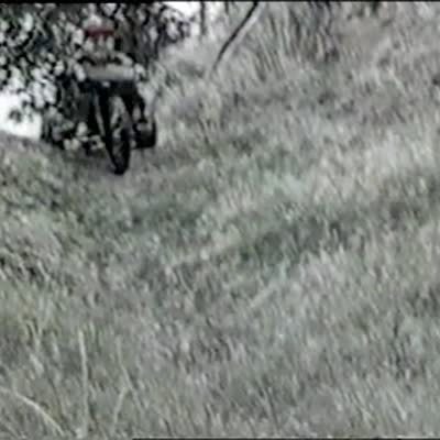 Young boy rides his Big Wheel bike & falls into a ditch. He is cheered on by a group of girls. Boy gets wet & runs away.