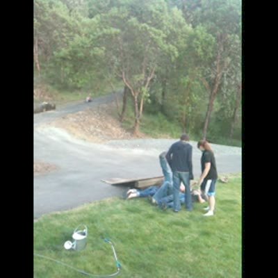 Man riding a go cart (lawnmower) with big wheels in rear, falls off cart, then the big wheels come off the cart. mower lawn grass cut