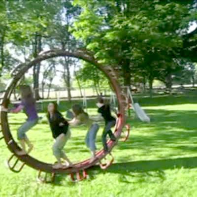 4 girls walk in big hamster wheel at park, one tries to hang from top, knocks all four girls down. Playground.