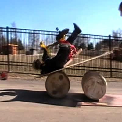 Teen on Big Wheel rides up homemade ramp that sits on barrels and falls off .